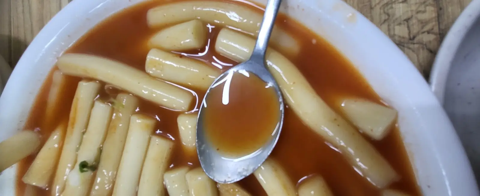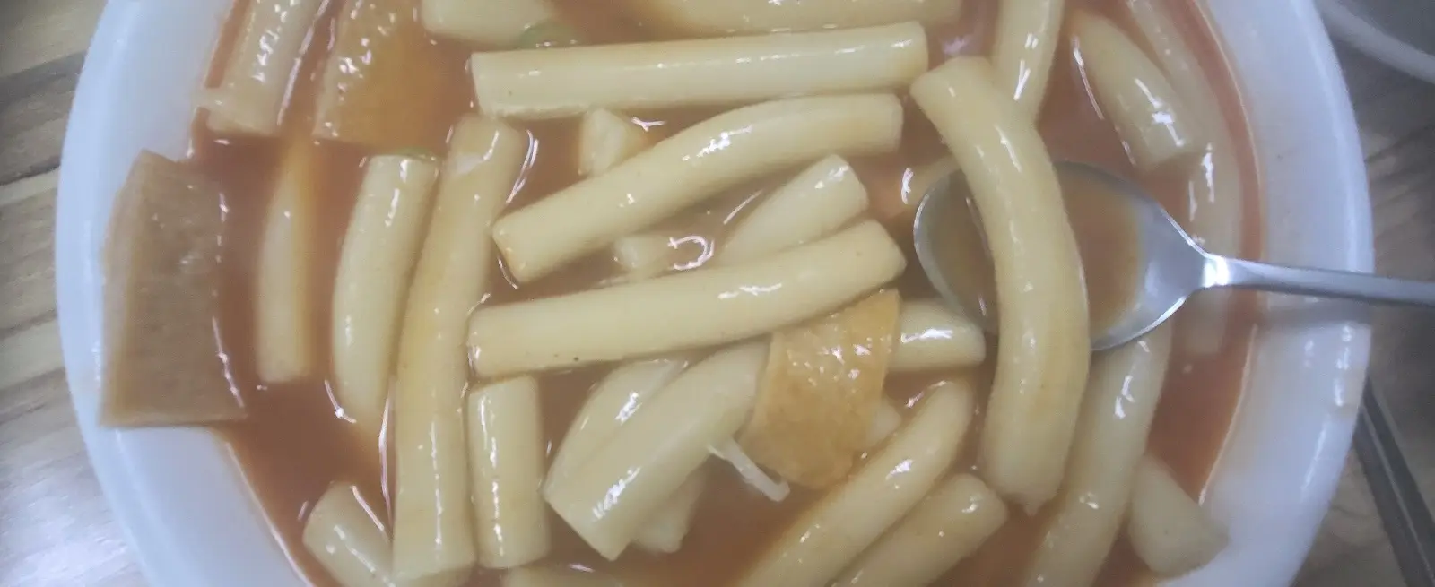 떡볶이는 그야말로 걸쭉하지 않은 흐르는 국물에 떡 역시 떡볶이 국물이 제대로 배지 않은 듯한 하얀색입니다.