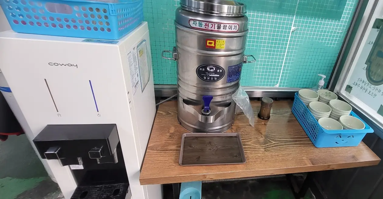 가게 안을 들어가 보면 언제든 먹을 수 있는 육수통과 정수기가 배치되어 있습니다. 벽면은 위에서 보셨든 각종 유명인 사인과 메뉴판이 조촐히 붙어있죠.