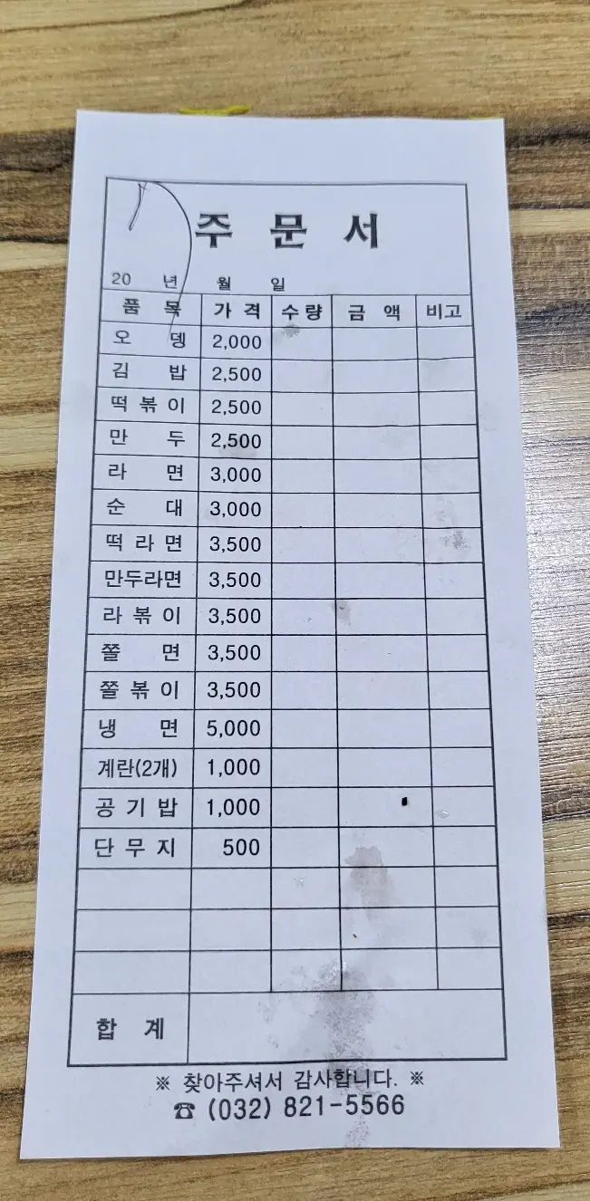 자리에 앉으면 주문서를 테이블에 올려줍니다. 주문할 메뉴를 직접 적어 아주머니에게 주면 주문완료죠.