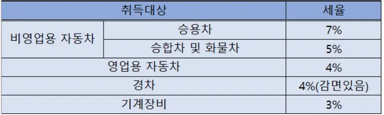 자동차를 구매하는 경우 취득세와 등록세를 함께 납부해야 합니다. 아래의 표는 자동차별 취등록세의 세율을 알려주고 있습니다.