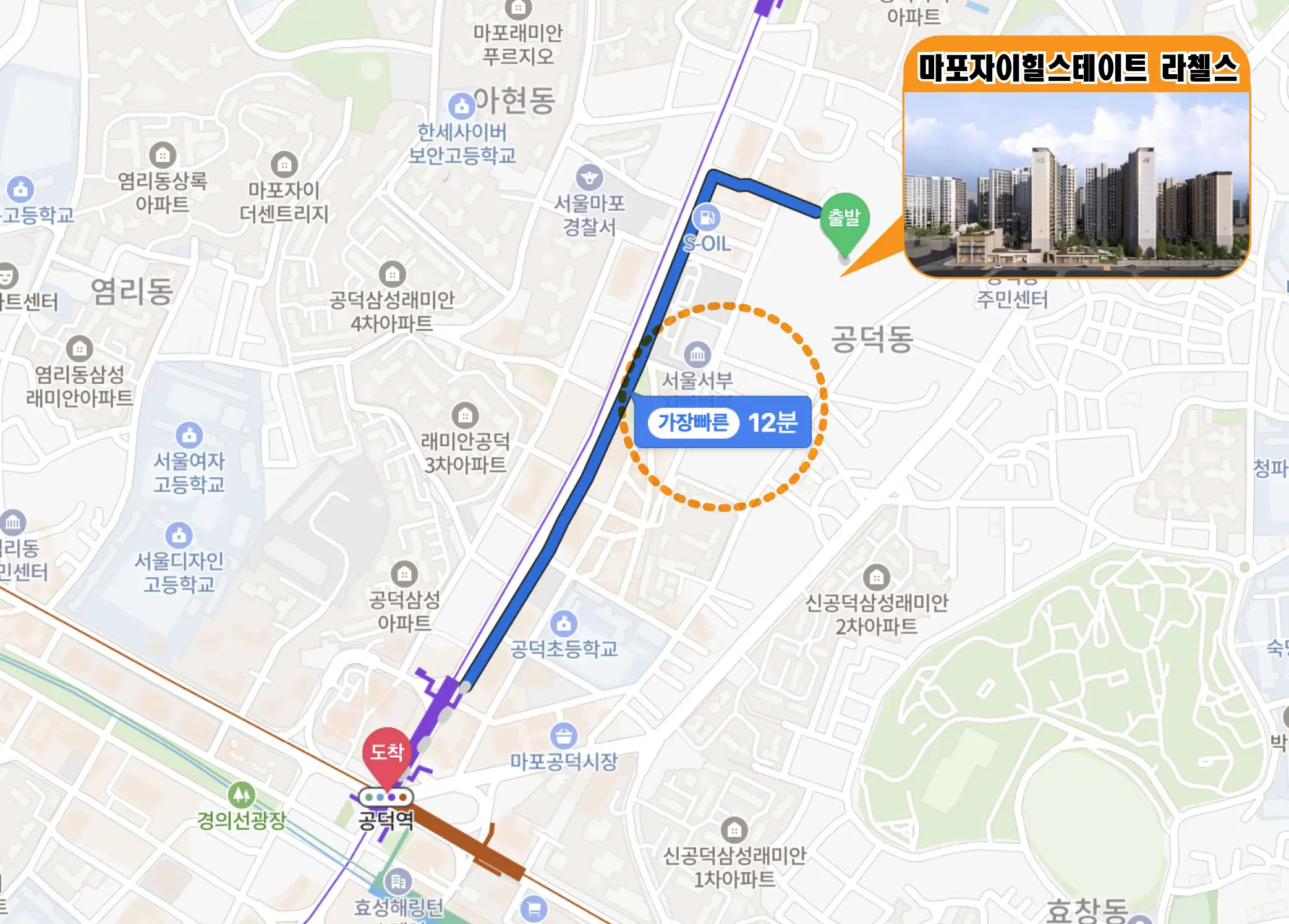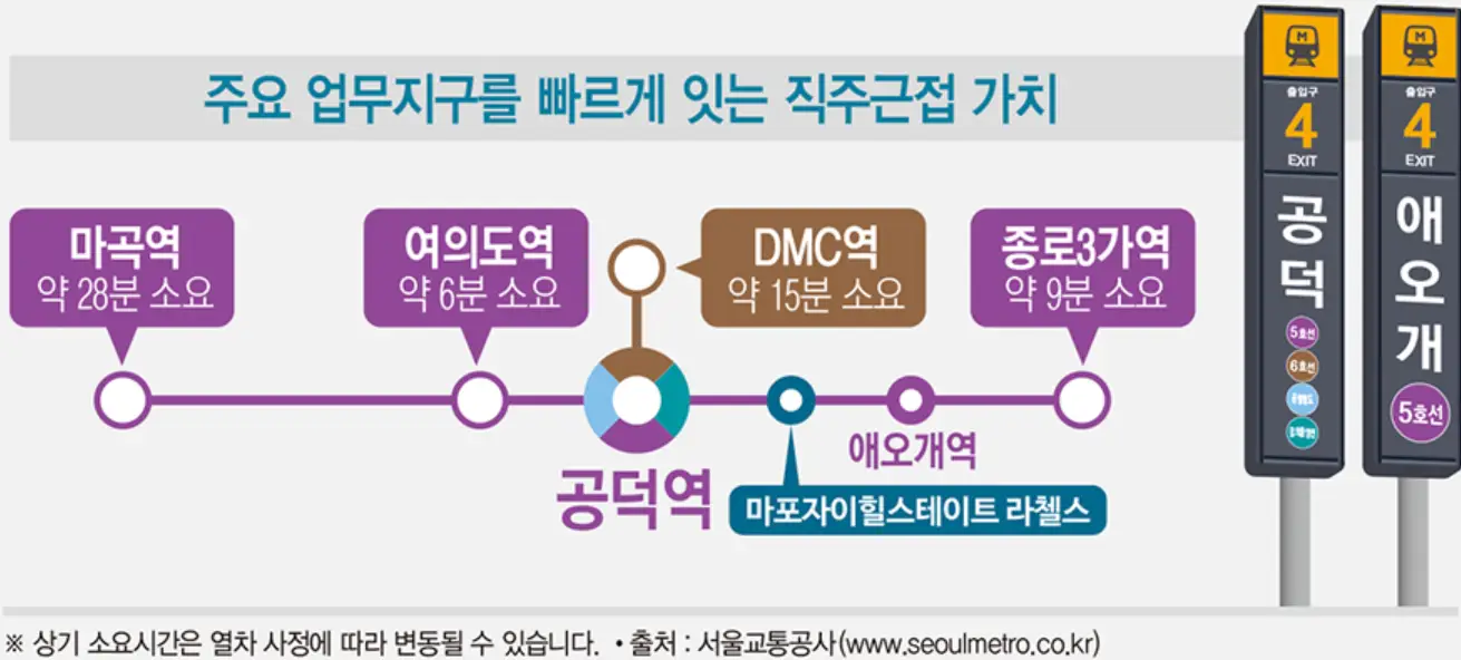 서울 강남과 강북일 잇는 최요충지 마포자이힐스테이트 라첼스는 5호선 애오개 역 5분, 6호선 경의중안선과 공항철도가 지나가는 공덕역까지 12분의 거리에 있어 도보로 간편하게 대중교통 이용이 가능합니다.