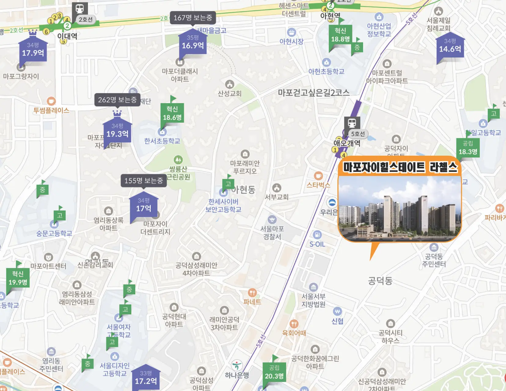 마포자이힐스테이트 라첼스 33편 기준 분양가는 17,2억으로 정해져 있으며 인근 아파트의 시세는 16.9억~19억대까지 다양하게 분포하고 있습니다.