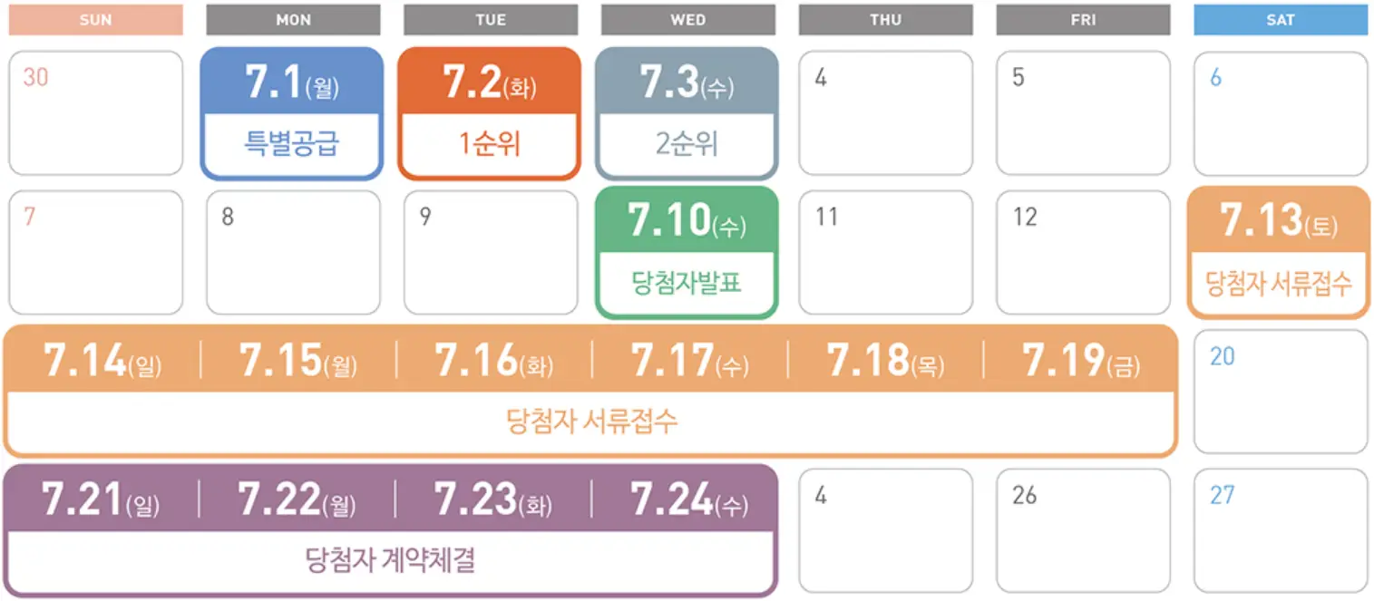 | 특별공급 | 24. 7. 1(월) | 24. 7. 10(수) | 24. 7. 13(토) ~ 24. 7. 19(금) |