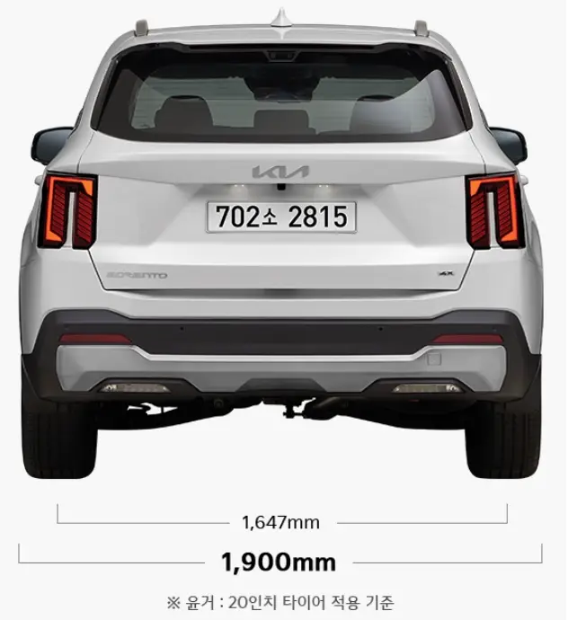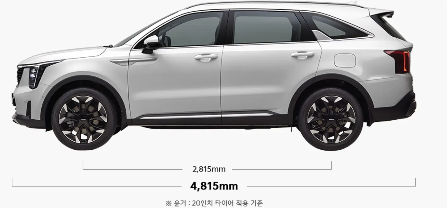 쏘렌토 하이브리드의 길이는 4,815mm이며 너비 1,900mm, 휠베이스 2,815mm, 높이 1,695mm로 넉넉하며 안정감 있는 중형 SUV의 면모를 갖추고 있습니다.