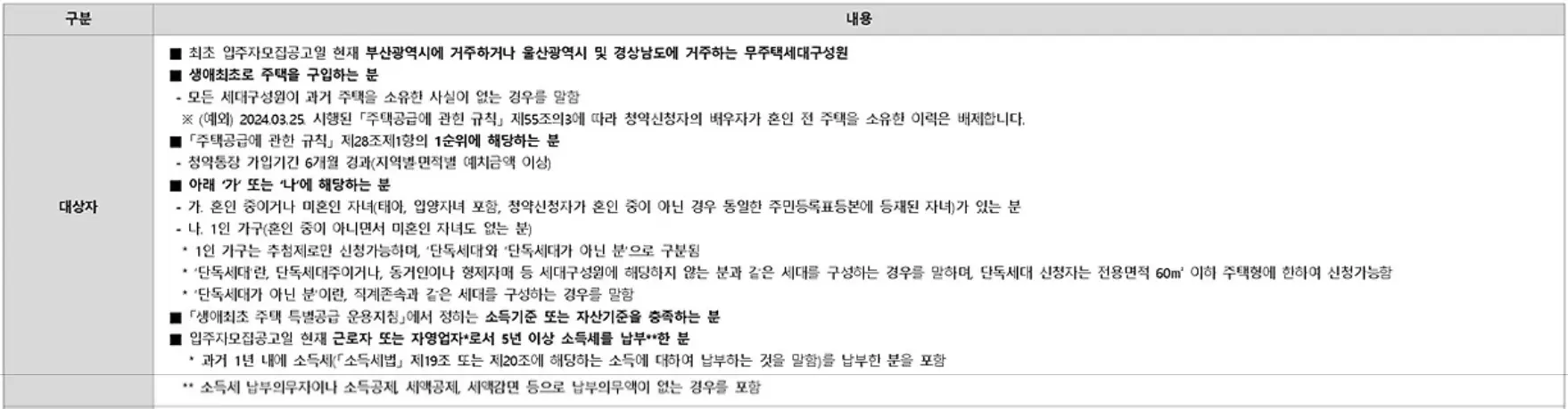 | 민영/민간택지 | 부산광역시 거주자 | 울산 및 경상남도 거주자 | 미적용 |