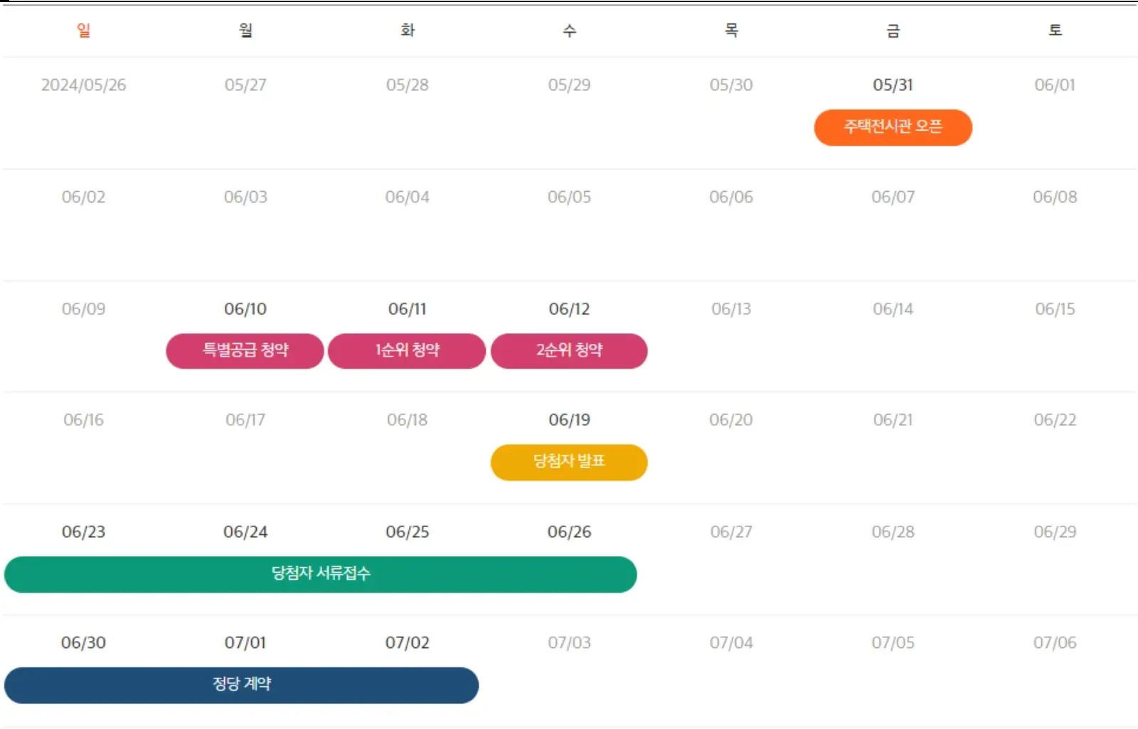 | 특별공급 | 24. 6. 10(월) | 24. 6. 19(수) | 24. 6. 23(일) ~ 24. 6. 26(수) |