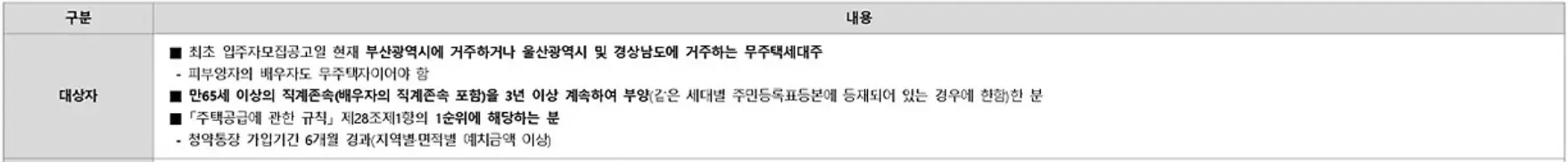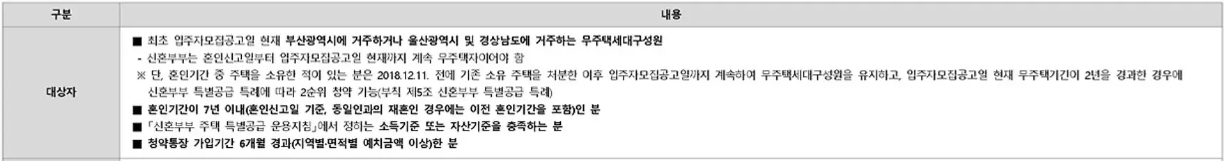 - 입주모집공고일 현재 부산광역시 거주 또는 울산광역시 및 경상남도 거주 만 19세 이상 또는 미성년 세대주