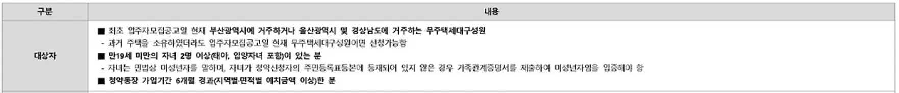 - 입주모집공고일 현재 부산광역시 거주 또는 울산광역시 및 경상남도 거주 만 19세 이상 또는 미성년 세대주