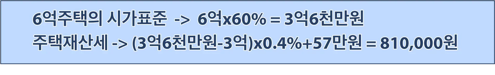 시가표준은 6억 X 60% = 3억 6천만 원이 산출됩니다. 여기에 3억 초과의 주택재산세율로 계산하면 (3억 6천만 원-3억) x0.4%+57만 원은 810,000원입니다.