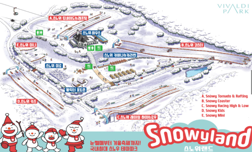 총 12개의 슬로프와 온 가족이 즐길 수 있는 스노위 랜드를 운영 스키를 타지 않아도 다양한 액티비티를 즐길 수 있습니다.