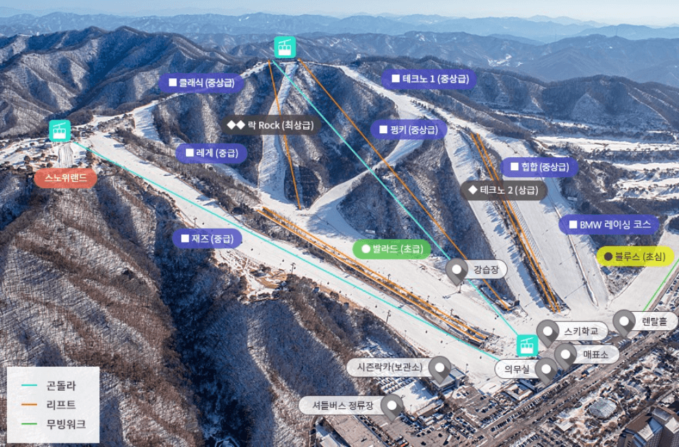 또한 세계스키연맹(FIS) 공인 대회전 코스와 고속 리프트, 곤돌라 및 장애인을 위한 슬로프도 운영, 국내최초도입된 첨단 핸즈프리 검색대는 리프트권소지 없이도 자유롭게 스키장을 이용할 수 있습니다.