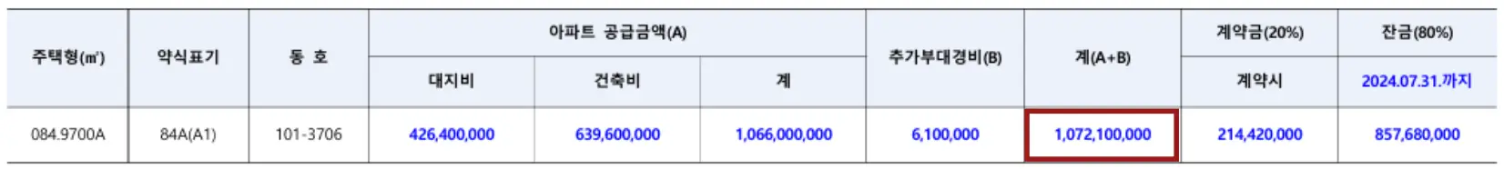 한양수자인 그라시엘 계약취소분 분양가는 부대경비 포함 10억 7,210만 원이며 발코니확장 비용 1,200만 원을 추가한 기존 계약 승계조건입니다.