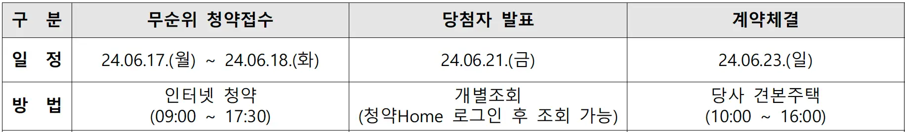 구분 무순위 청약접수 당첨자발표 계약체결