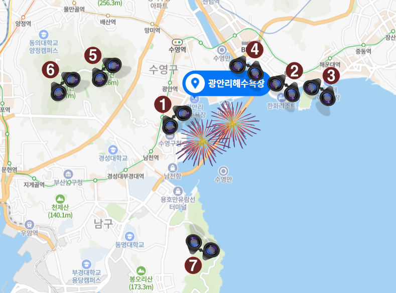 무료 불꽃 관람 명소로는 1. 광안리해수욕장 / 2. 마린시티 / 3. 더베이 101 / 4. 부산요트베이 / 5. 금련산 / 6. 황령산 / 7. 이기대공원등이 있습니다.
