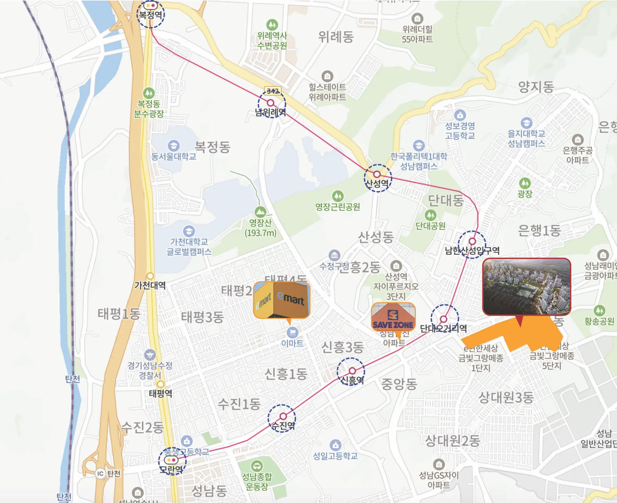 인근 학군으로는 새로 들어설 하원초를 비롯, 단남초, 금나초와 함께 대원중과 숭신여중 등이 인근에 있어 통학 학세권을 이루며 인근에 세이브존 이마트가 자차 10분 거리에, 현대백화점, 아브뉴프랑 판교는 자차 30분 내 위치하여 생활인프라 역시 편리하게 조성되어 있습니다.